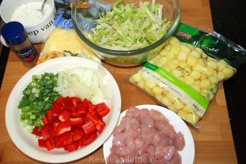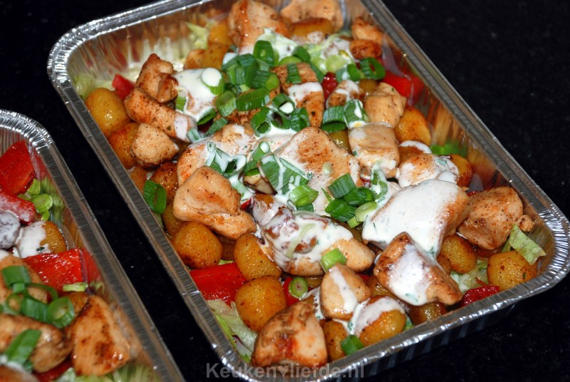 Na het succes van de kapsalon is het nu tijd voor een lekkere en iéts gezondere variant, de kipsalon! In plaats van shoarma gebruik ik kipfilet en de friet vervang ik door smaakvolle krieltjes.