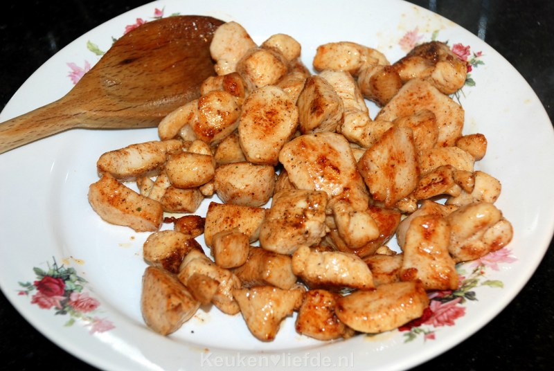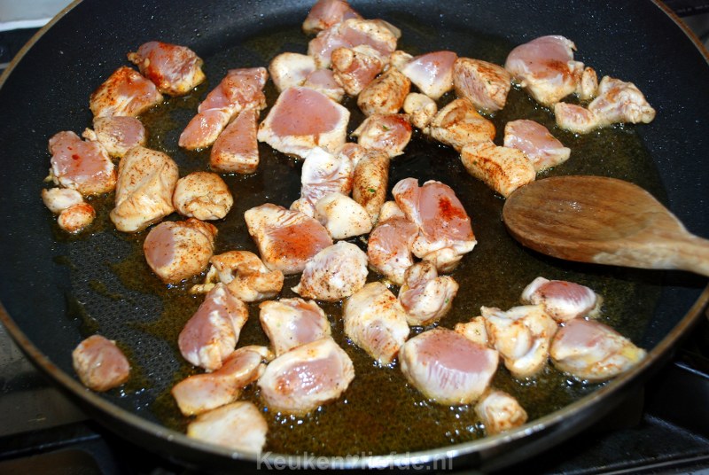 Verhit een grote koekenpan met wat olie en bak de kip met wat paprikapoeder, zout en peper op hoog vuur goudbruin. Schep de kip uit de pan op een bord en zet opzij.