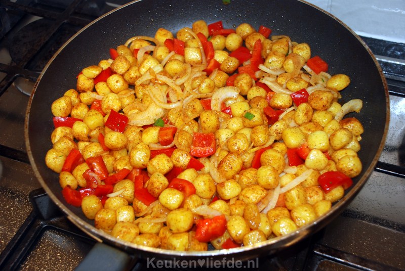 Bak in dezelfde pan de krieltjes met paprikapoeder, zout en peper. Voeg eventueel wat extra olie toe. Voeg de laatste 2 minuten de paprika en ui toe en bak mee totdat alles gaar is en de groenten zacht zijn.