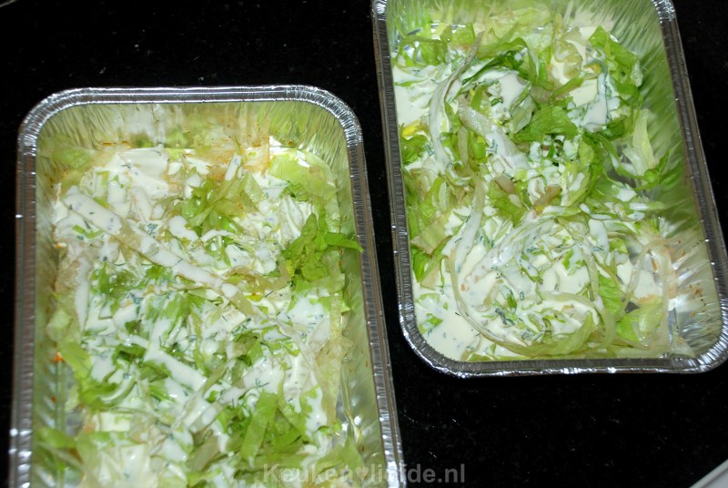 Zelfgemaakte knoflooksaus is klaar, kaas is geraspt. Zo nog even ijsbergsla kopen… Dit recept staat voor vanavond op het menu; zo benieuwd!
