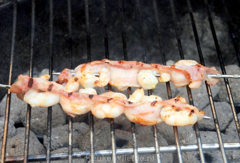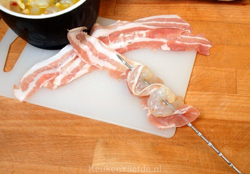 Rijg om en om de bacon en garnalen op de satépen, totdat er op iedere pen 5 garnalen zitten en een plakje spek.