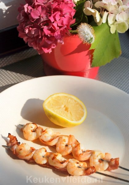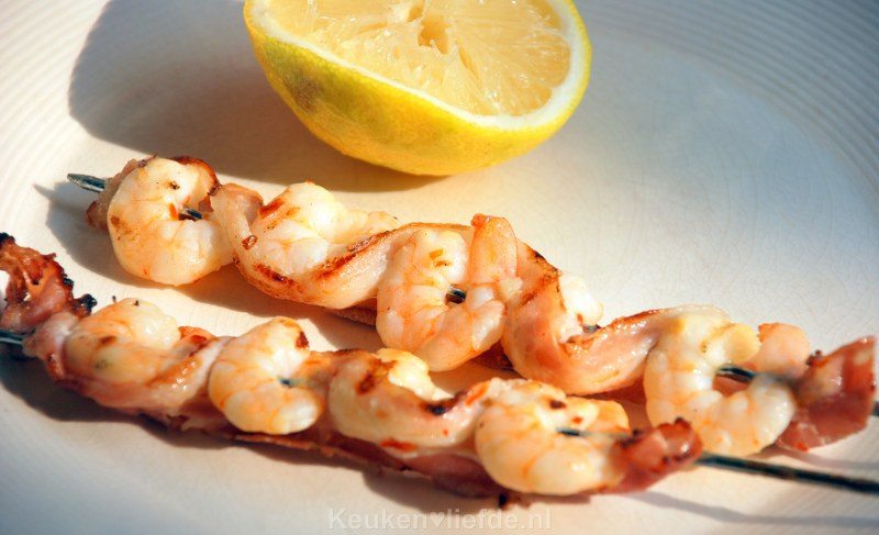 Eindelijk kunnen we vandaag weer even genieten van een stralende dag en natuurlijk hoort daar een heerlijk zonnig recept bij! Deze smaakvolle garnalenspies is gemarineerd in een knoflook-chili marinade en omwikkeld met bacon. Ze smaken heerlijk van de barbecue, maar bij minder mooi weer kun je ze natuurlijk ook prima binnen bereiden in de grillpan, of oven.