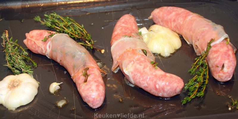Tip! In plaats van de bacon om de worst heen te wikkelen, kun je de bacon ook naast de worst op het bakblik leggen. Op die manier wordt ook het vel van de worst zelf lekker krokant.