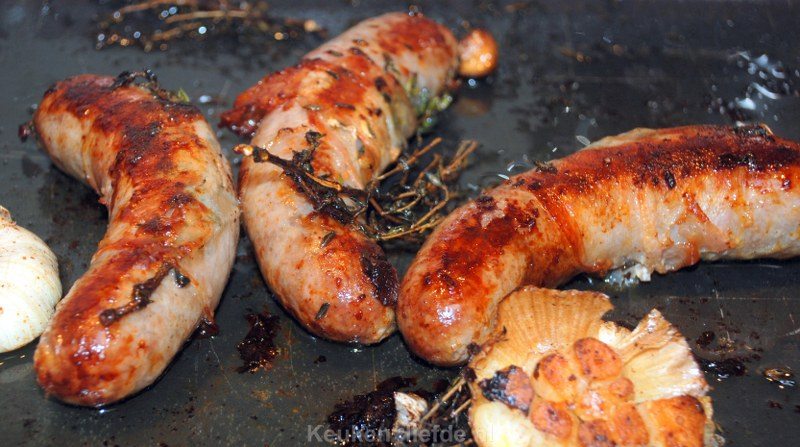 Bak de worstjes in ongeveer 20 minuten knapperig, goudbruin en gaar. Draai de worstjes halverwege de baktijd een keertje om en controleer of de knoflook niet verbrandt. Haal de knoflook eventueel eerder uit de oven of draai ze om zodat ze met de snijkant naar boven liggen. De knoflooktenen kun je naderhand zo uit de bol drukken en hebben een verrukkelijke zachte en gepofte smaak gekregen.