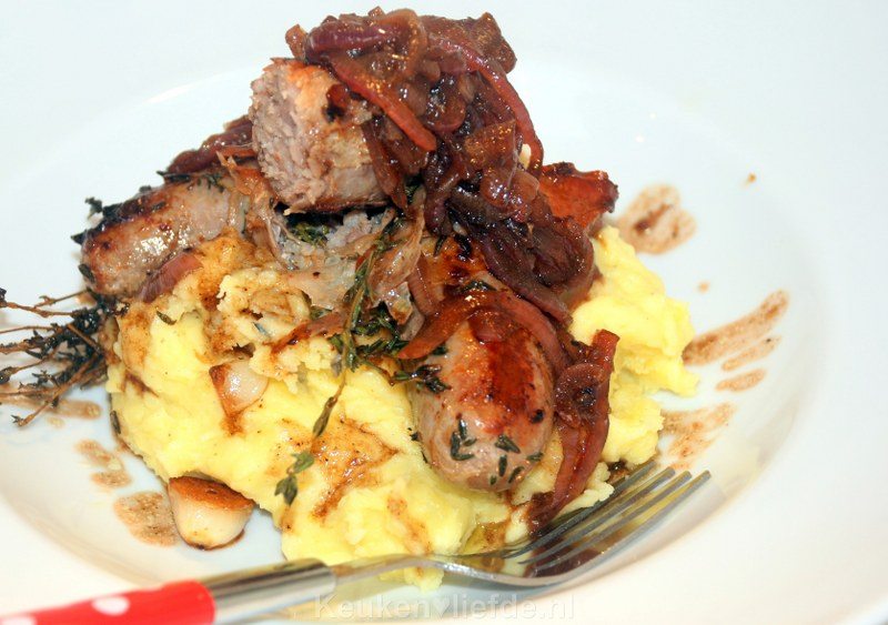 Serveer de worstjes en knoflooktenen bijvoorbeeld met deze pittige aardappelpuree en verrukkelijke rode uienjus.