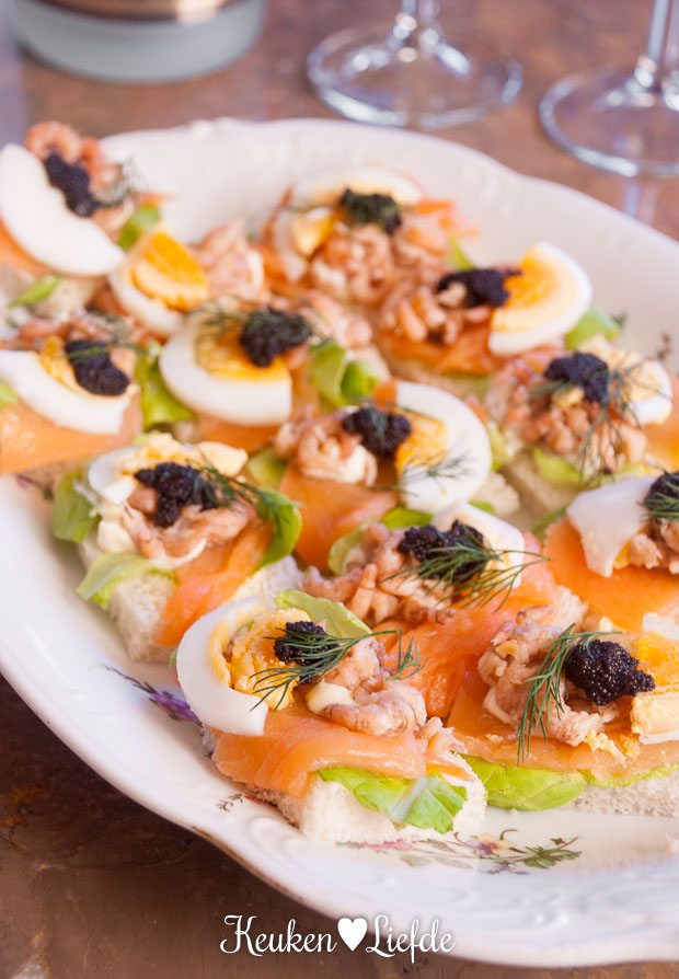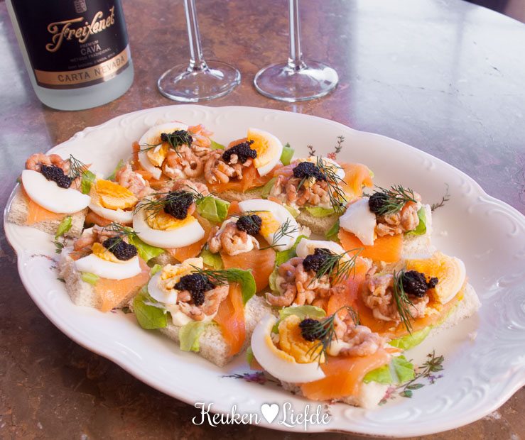 Het staat vast. Mijn moeder maakt de lekkerste vishapjes ter wereld. Nu schudt ze al zo lang ik me kan heugen zonder blikken of blozen verbluffend lekkere gerechten uit haar koksmouwen, maar haar vishapjes … geloof me, die zijn briljant! Deze feestelijke casinohapjes met gerookte zalm, Hollandse garnalen en kaviaar kwamen als aperitief op tafel tijdens de zevenstigste verjaardag van mijn vader. Natuurlijk met een feestelijk glaasje bubbels erbij. Kortom, een zalig begin van een gezellige avond!