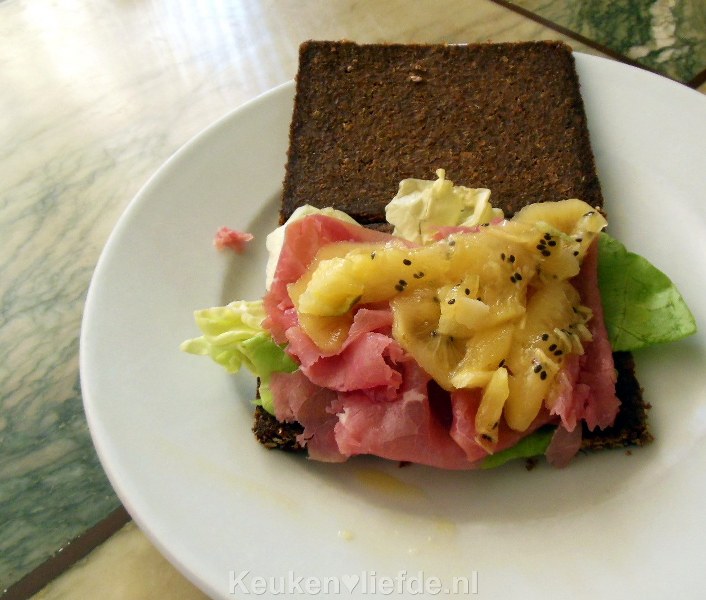 Dit keer ontving ik van Lya dit heerlijke en gezonde lunchgerecht met roggebrood, sla, runderrookvlees en kiwi. Zoals Lya zelf al zegt, “prima vetloos voor mensen die op dieet zijn.” En erg lekker natuurlijk!