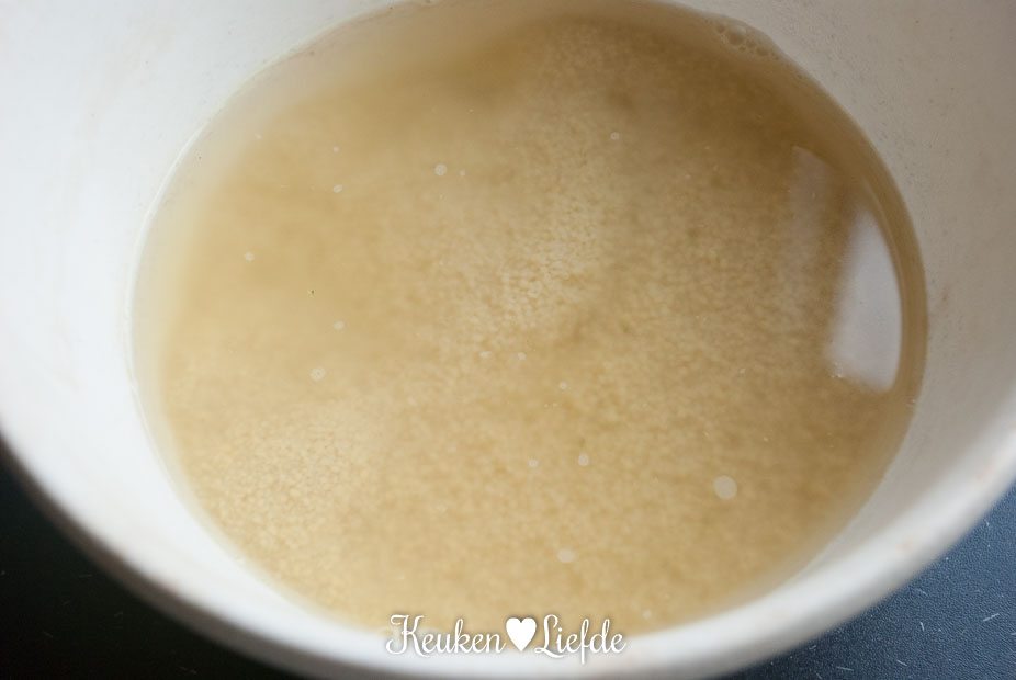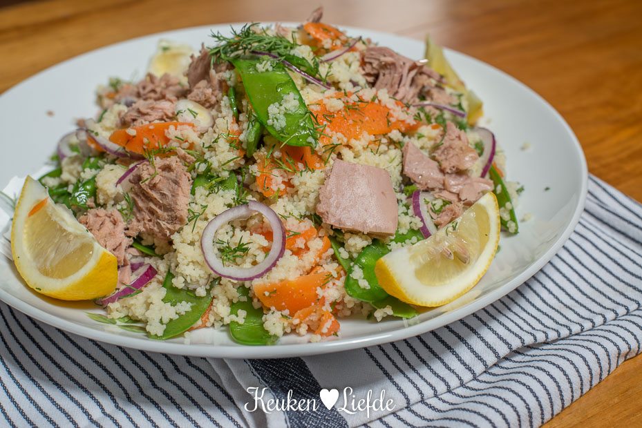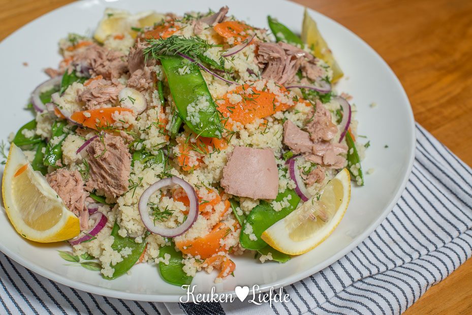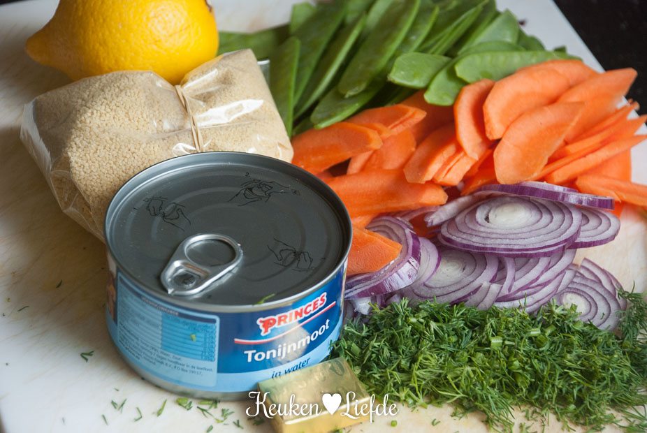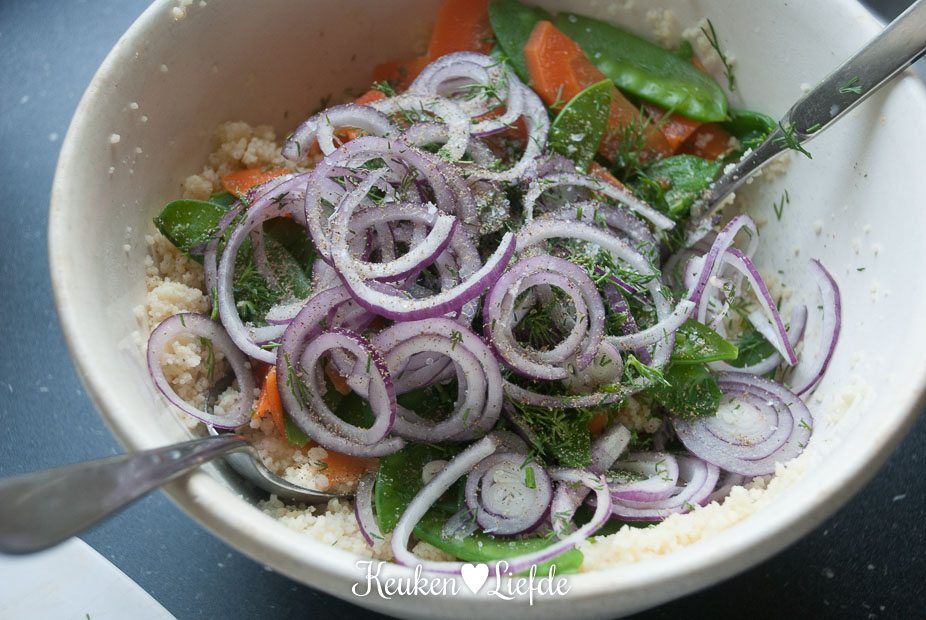 Doe de couscous in een diepe kom of schaal en overgiet met het opgevangen kookvocht, zoveel totdat de couscous nét iets onder staat (je hoeft dus niet al het vocht te gebruiken). Dek af met een bord en laat circa 8 minuten staan. Roer de couscous los met een vork en meng de groenten, ui, dille en tonijn erdoor.
