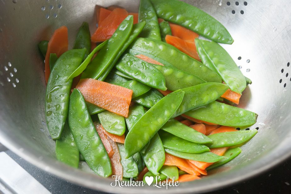• 100 g wortel, geschrapt of geschild en in evengrote dungesneden plakjes als de peulen