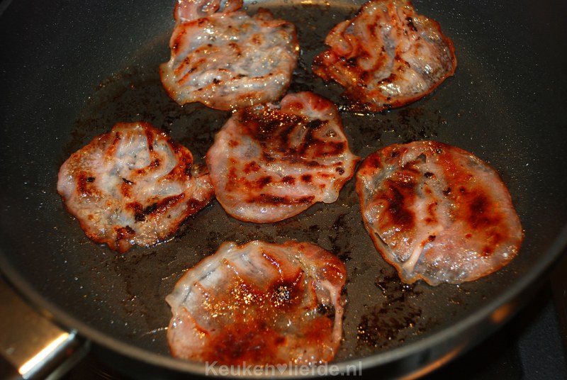 Bak de bacon knapperig uit in een koekenpan of in de oven en laat daarna uitlekken op een stukje keukenpapier.