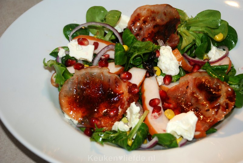 Doe de sla in een kom en hussel om met wat olijfolie en de grenadinesiroop. Breng op smaak met zout en peper. Verdeel de sla over twee borden en verdeel de kipfilet, bacon, feta, ui, mais en granaatappelpitjes erover.