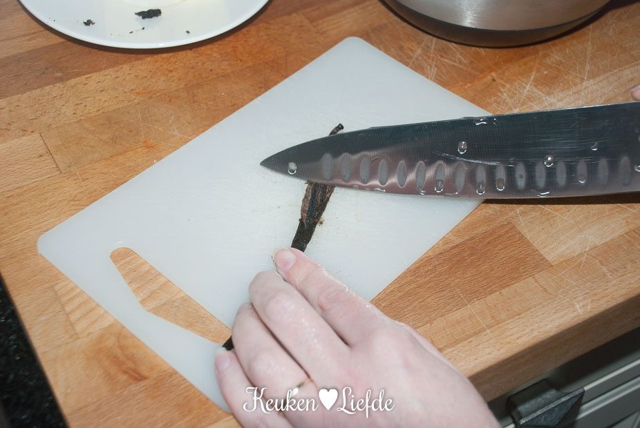 Snijd de helft van het vanillestokje open en schraap met een mes het merg eruit. (De andere helft kun je bewaren in een luchtdichte zak voor een ander recept, of in een suikerpot stoppen voor zelfgemaakte vanillesuiker.)