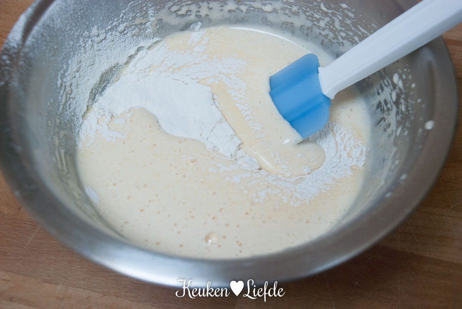 Klop de suiker, eieren en vanillemerg, totdat het mengsel lichtbleek van kleur wordt, romig en luchtig is. Dit kan wel 5 tot 10 minuten duren. Roer het zout door de bloem en zeef 1/3 van de bloem boven het eimengsel. Spatel luchtig door het beslag en zeef dan weer 1/3 van de bloem erboven. Ga zo door totdat de bloem op is. Voeg de bijna gesmolten roomboter toe en spatel zo luchtig mogelijk door het beslag.