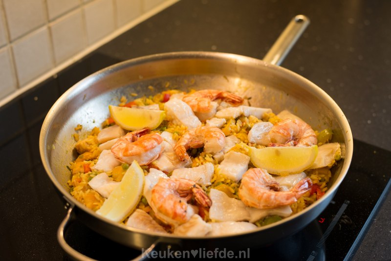 Tip! Voeg eventueel op het laatst ook nog wat gekookte mosselen aan de paella toe.