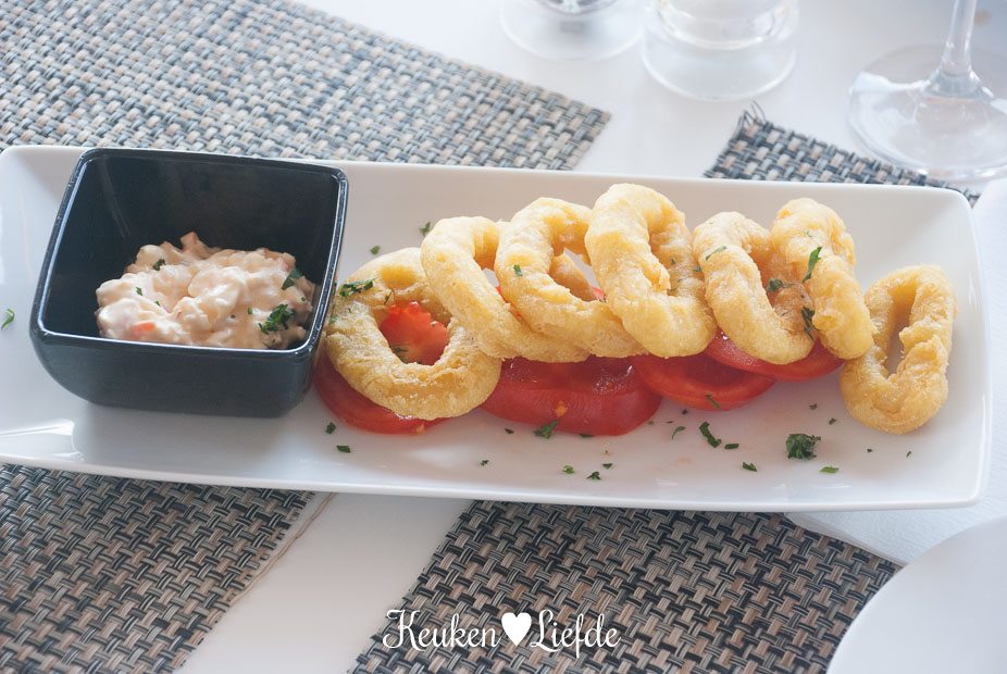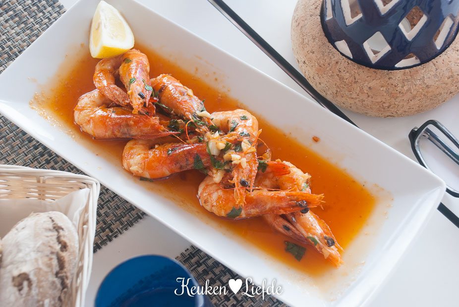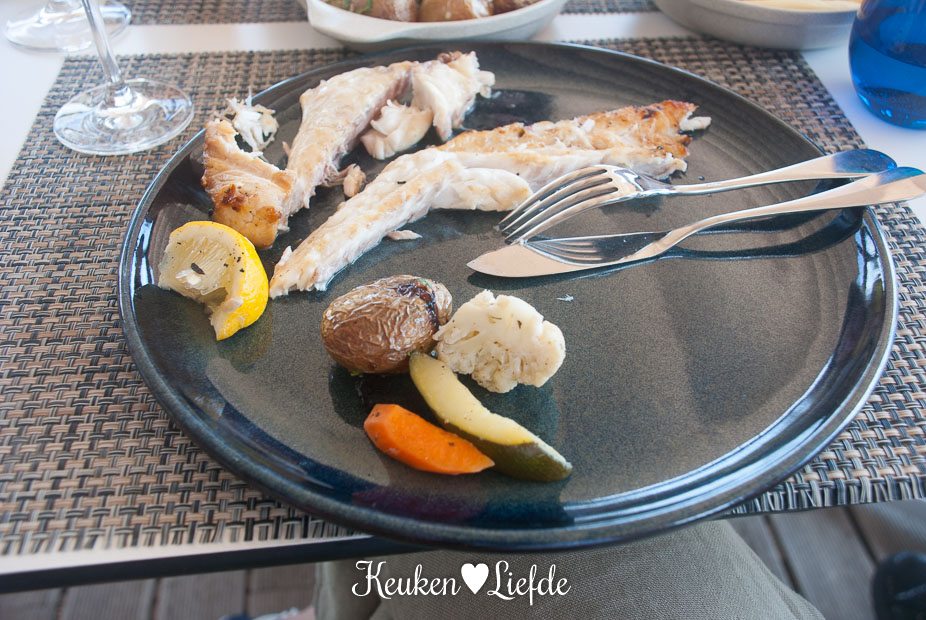 ’s Middags lunchen we wederom in Restaurant As Dunas. Ons voorafje is knabbelen aan gefrituurde inktvisringen en grote garnalen. Daarna mogen we smikkelen van een zee aan verse vis, die voor onze neus gefileerd wordt. Top! De geroosterde knoflookaardappels, verse groenten en partjes citroen maken dit smulfestijn helemaal af.