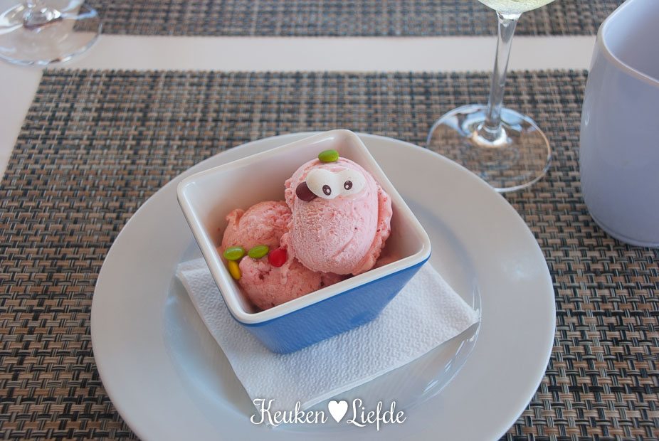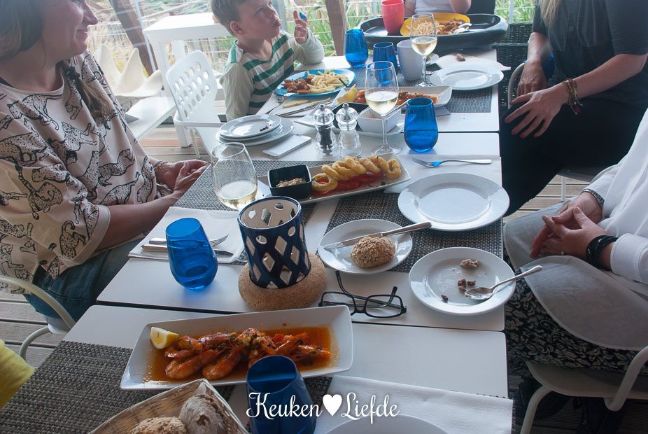 De kinderen wacht een uitgebreid kindermenu, maar Ella-Marie smult met ons mee van inktvisringen, garnalen en brood met tapenades. Het aardbeienijsje met vrolijk gezichtje is het kersje op de taart.