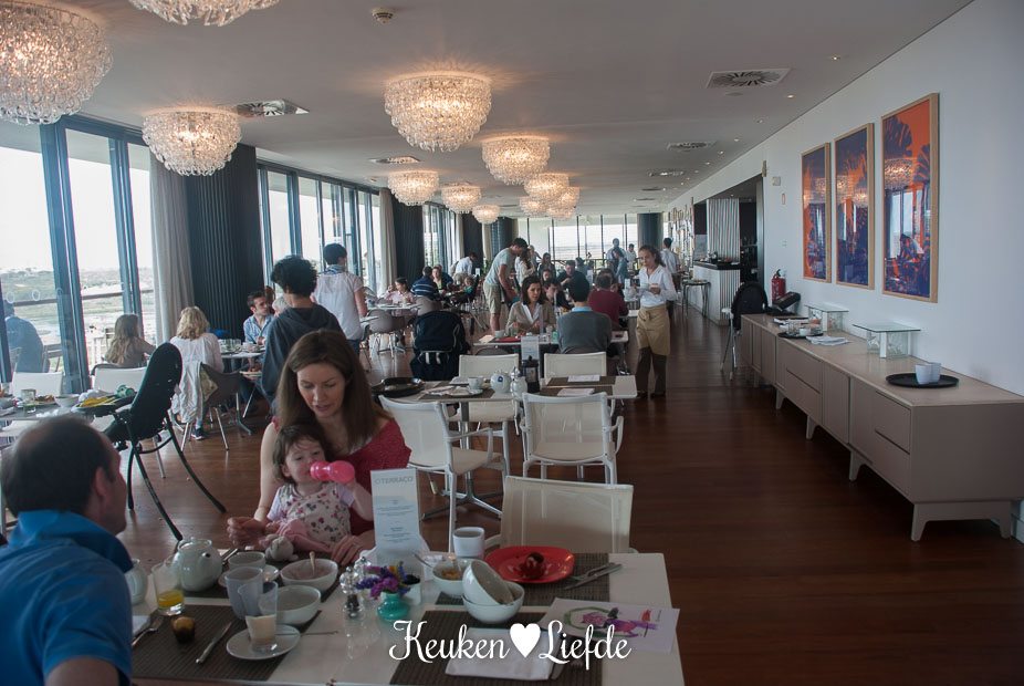 Na een ontspannen nachtrust marcheren Ella-Marie en ik de volgende ochtend naar het hoofdgebouw van Martinhal. Naast de centrale receptie vind je hier op de eerste verdieping Restaurant O Terraςo, met fraai terras en magnifiek uitzicht over de Middellandse Zee.
