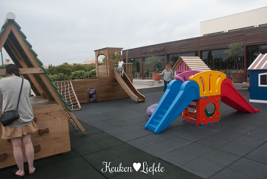 Een opwindende rit in een opgevoerd golfkarretje volgt en plotsklaps staan we op het ‘dorpsplein’: een ruime kinderspeelplaats met diverse klimtoestellen en op de grond zachte matten, omgeven door een royaal terras. Daaromheen zijn diverse faciliteiten te vinden, zoals de Raposinhos kinderclub voor de kleintjes (er zijn maar liefst vijf kidsclubs voor kinderen in de leeftijd vanaf 6 maanden tot en met 16 jaar!), een Blue Room voor oudere kinderen, de M Bar (een relaxte familiesurfbar, waar je terecht kunt voor onder meer ontbijt, lunch, koffie, thee, cocktails en vers schepijs uit de ijssalon) en het Italiaanse Restaurant Os Gambozinos. Tegenover het dorpsplein staat een groot gebouw met daarin een fitnessruimte, overdekt zwembad, Mercado-supermarkt en Biondi-coutureshop.
