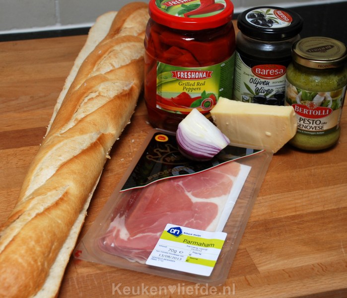 Dit mediterraans belegd stokbrood met o.a. pesto, zwarte olijven en parmaham smaakt uitstekend als lunchgerecht. Alle ingrediënten voor dit gerecht, op de parmaham na, heb ik eigenlijk altijd wel in huis omdat ze lang houdbaar zijn. Zo kun je zonder teveel moeite altijd een bijzonder lekker gerecht op tafel toveren.