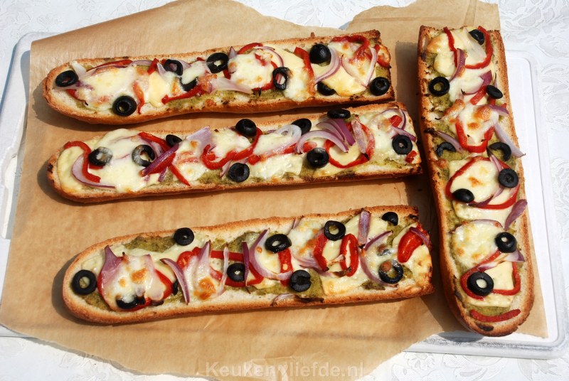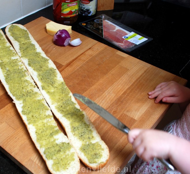 Verwarm de oven voor op 200 graden. Snijd het stokbrood over de lengte doormidden en besmeer beide helften met pesto.