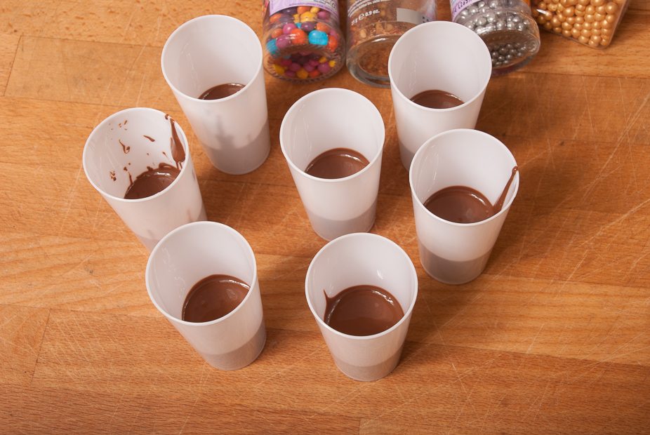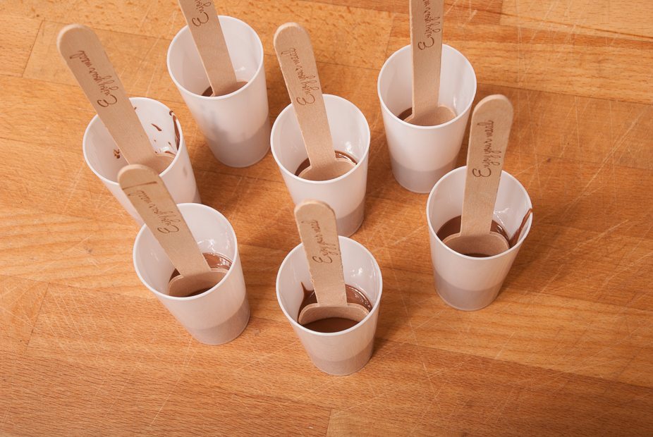 Kun je geen hoge amuseglaasjes of vormpjes vinden? Je kunt ook siliconen bonbonvormpjes gebruiken en de lepel er pas inzetten als de chocolade iets is opgesteven. Past de lepel niet in de vorm. Gebruik dan een rietje of een roerstaafje.