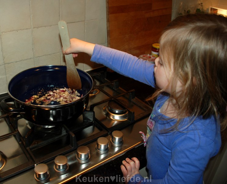 Verwarm de oven voor op 200 graden. Verhit een hapjespan met een scheut olijfolie en bak de ui glazig.