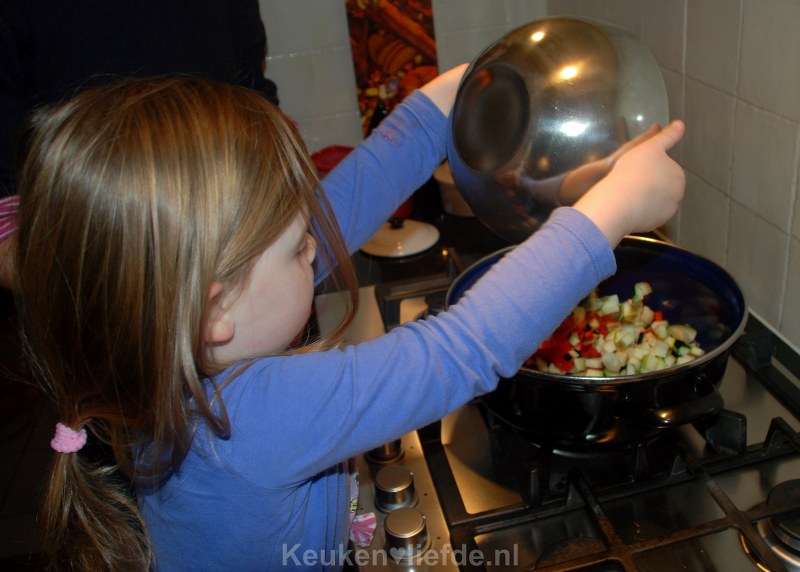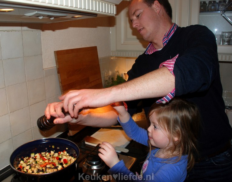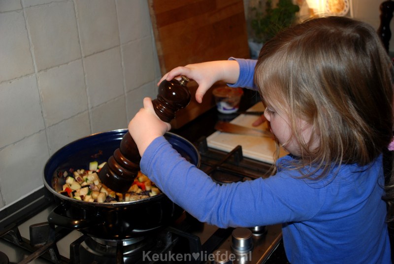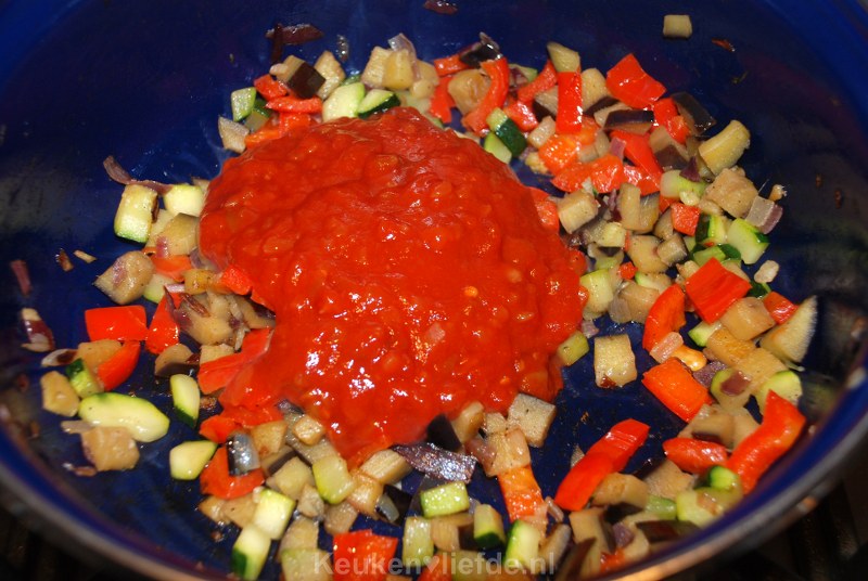 Voeg dan de courgette, aubergine, paprika en knoflook toe en bak verder totdat ze zacht zijn. Voeg eventueel nog wat extra olijfolie toe als het mengsel te droog wordt want aubergine is net een spons, het zuigt alles op.