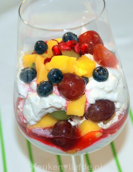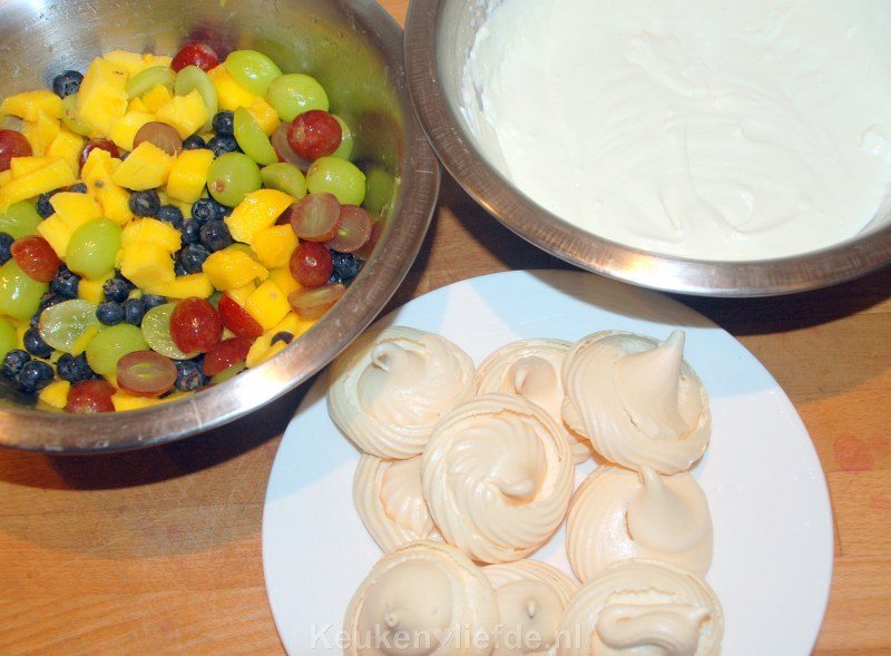 Snijd het fruit in kleine stukjes. Klop de slagroom met wat suiker stijf.