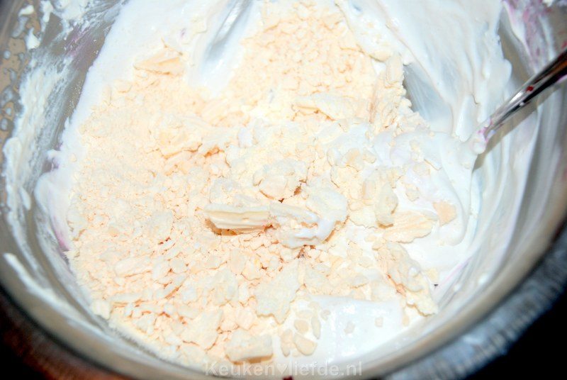 Verkruimel de meringues grof en spatel deze voorzichtig door de slagroom.