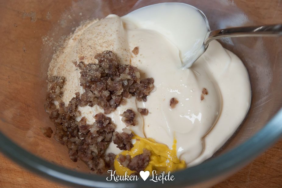 Mjammie, wat een heerlijke salade en een verrukkelijke saus, schaal van de saus gaat ” schoon” in de afwas, toppertje??