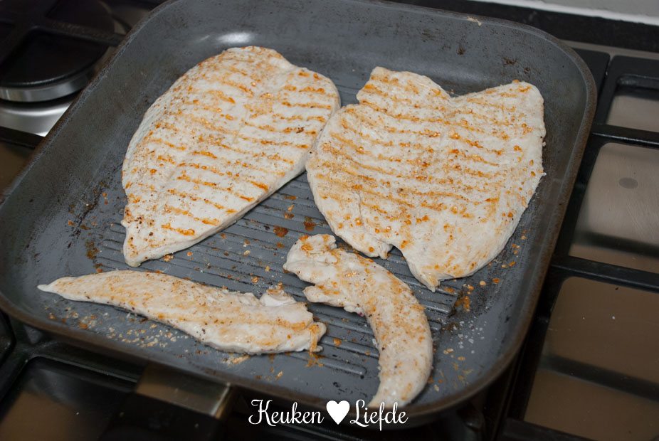 Verhit de grillpan. Trek de kipfilethaasjes los van de kipfilet. Snijd de kipfilet over de lengte in, maar niet helemaal doormidden, zodat je hem open kunt klappen. Zo is de kip tijdens het grillen sneller gaar. Bestrooi de kip met zout en peper en gril aan beide kanten in een hete grillpan, totdat hij nét gaar is. De kipfilethaasjes zijn mogelijk sneller gaar. Leg de kip op een bord en bestrijk met wat van de dressing. Laat de kip rusten.
