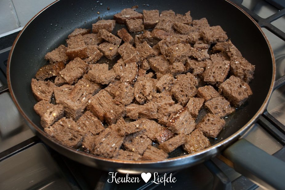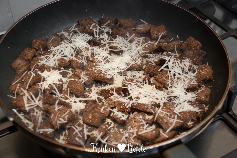 Brood goudbruin bakken in koekenpan met olijfolie en bestrooien met geraspte Parmezaan. Schep de croutons op een bord.