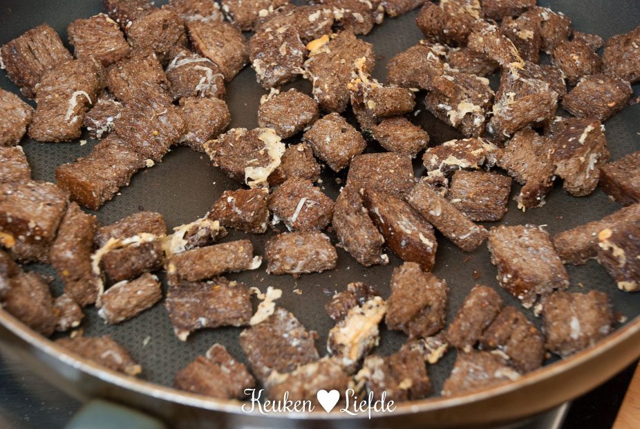 - 2 dik gesneden plakken brood, in blokjes gesneden