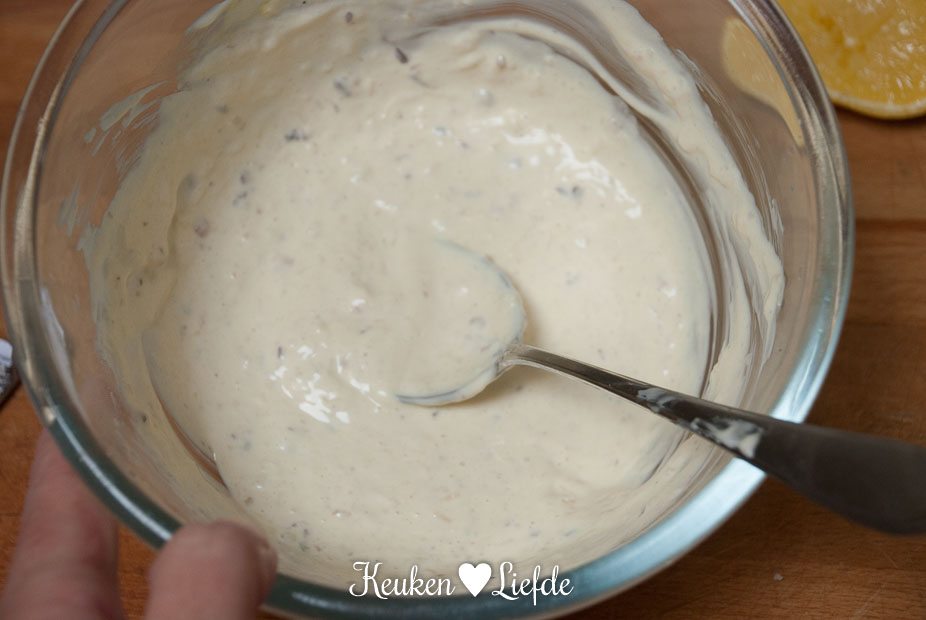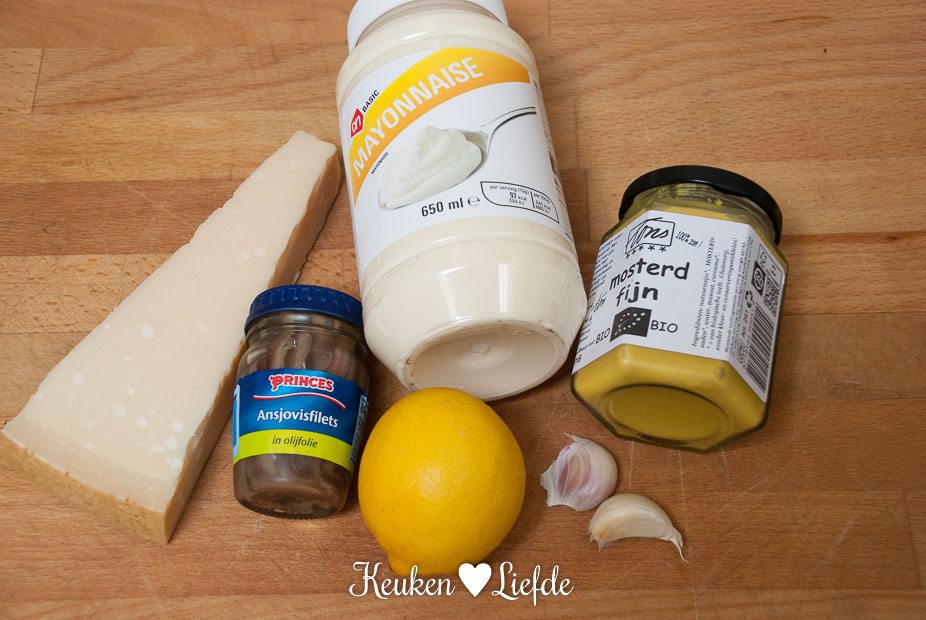 Meng de mayonaise met de mosterd, ansjovis, knoflook, Parmezaan en breng op smaak met wat citroensap. Voeg een scheutje water toe om de dressing iets meer vloeibaar te maken.
