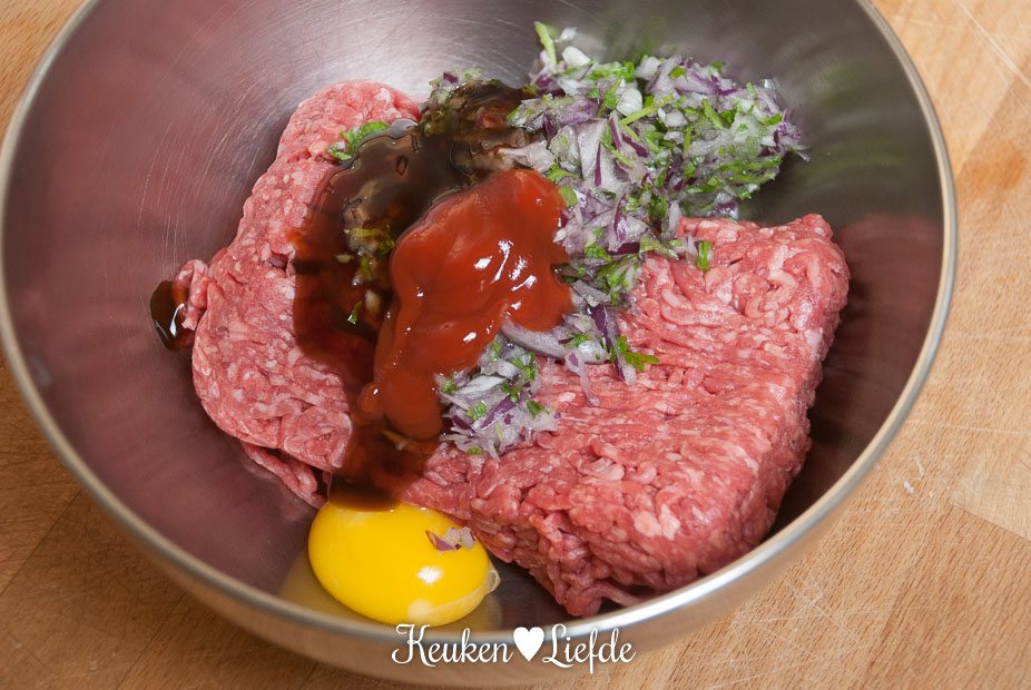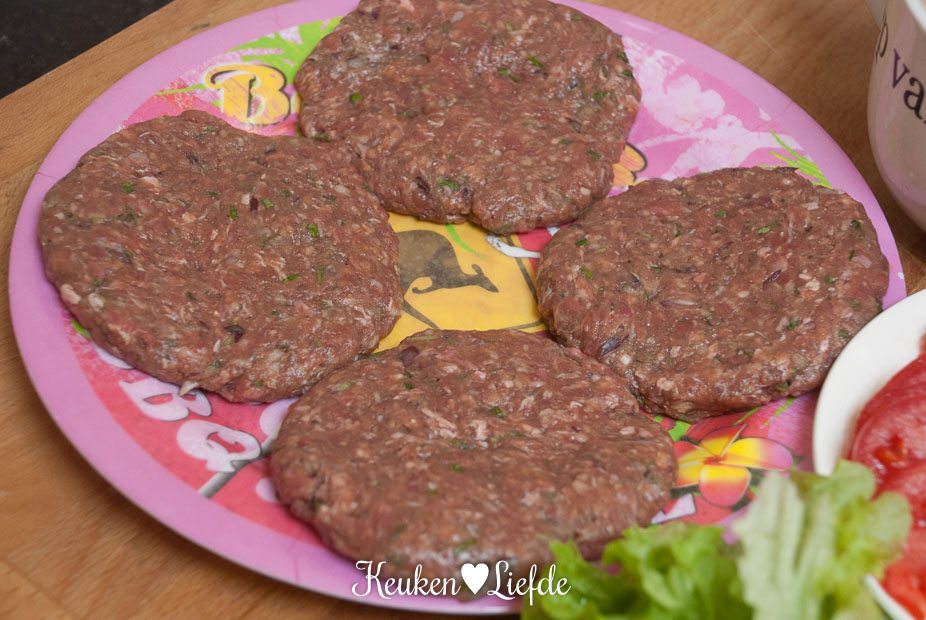 Kneed alle ingrediënten voor de hamburgers door elkaar en vorm er 4 gelijke hamburgers van. Leg ze op een bord en dek af met vershoudfolie. Laat ze minimaal een uur in de koelkast rusten.