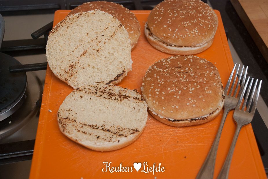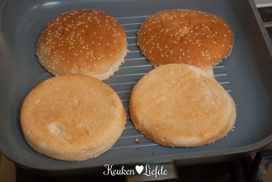Verwarm de barbecue of grillpan. Snijd de broodje open en grill ze, totdat ze mooie grillstrepen hebben.