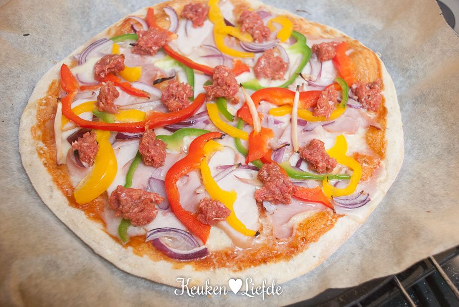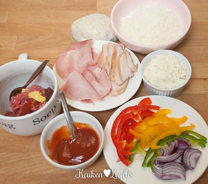 *Gekruid gehakt= rauw rundergehakt mengen met een klein scheutje worchestersaus en een theelepel ketchup, sambal manis en mosterd. Voeg eerst van alles een klein beetje toe en roer goed door, het gehaktmengsel mag niet nat zijn. Om te proeven of het gehakt goed op smaak is, kun je eerst een klein stukje gehakt bakken. Het gehakt gaat straks namelijk rauw op de pizza.