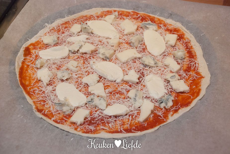 Verwarm de oven voor op de hoogste stand. (Bij ons is dat 220 graden.) Besmeer de pizzabodem met de tomatensaus — houd 1 cm van de rand vrij — en beleg met de vier kazen. Begin met geraspte pecorino en verdeel dan de overige kazen erover.