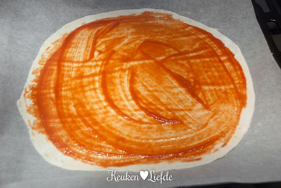 *Voor de pizzabodem gebruik ik een zelfgemaakt pizzadeegbolletje van circa 150 gram. Probeer ook eens je pizzadeeg zelf te maken, het is echt niet moeilijk!