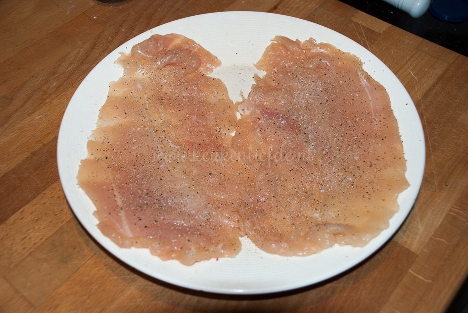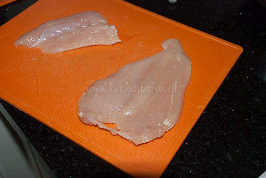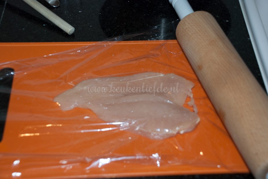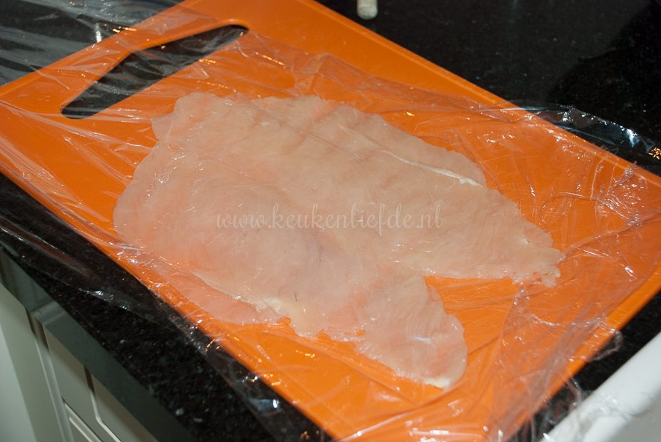 Snijd de kipfilets over de lengte open, maar niet helemaal doormidden. Vouw de kipfilets open. (De kipfilethaasjes snijd ik meestal wel los van de kipfilet.) Dek de kipfilets af met een stukje vershoudfolie en sla met een vleeshamer of onderkant van een sauspan, zo plat mogelijk. Probeer het vlees niet kapot te slaan. Bestrooi beide kanten met peper en zout.