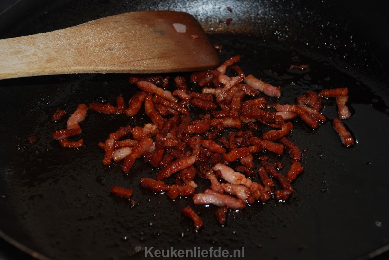 Bak in een droge koekenpan met antiaanbaklaag de spekjes knapperig en laat ze iets afkoelen.