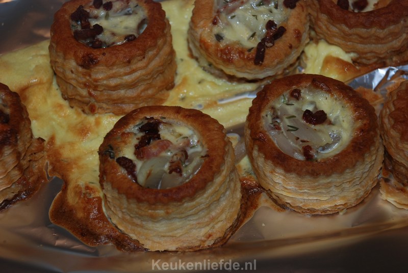 Dit is echt een superlekker voorgerechtje, kleine pasteibakjes gevuld met een ei-roommengsel. Wij hebben dit al vaak gemaakt voor onszelf en voor gasten en het is iedere keer weer een succes.