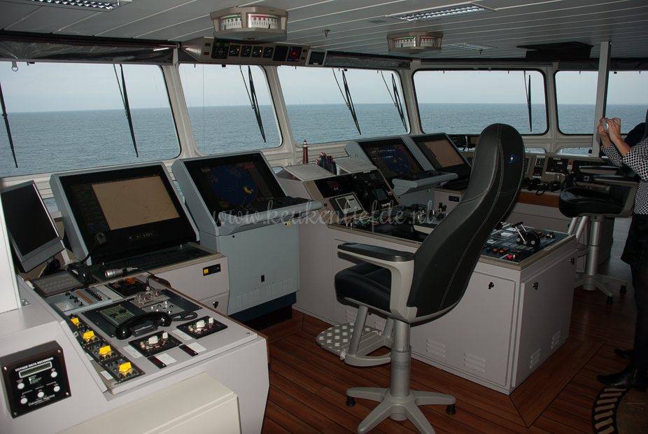 Ondertussen zijn we hoog boven zee de brug binnengewandeld om de hand te schudden van de sympathieke kapitein.