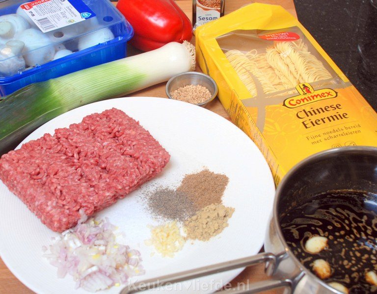 Noedels met gehaktballetjes in teriyakisaus