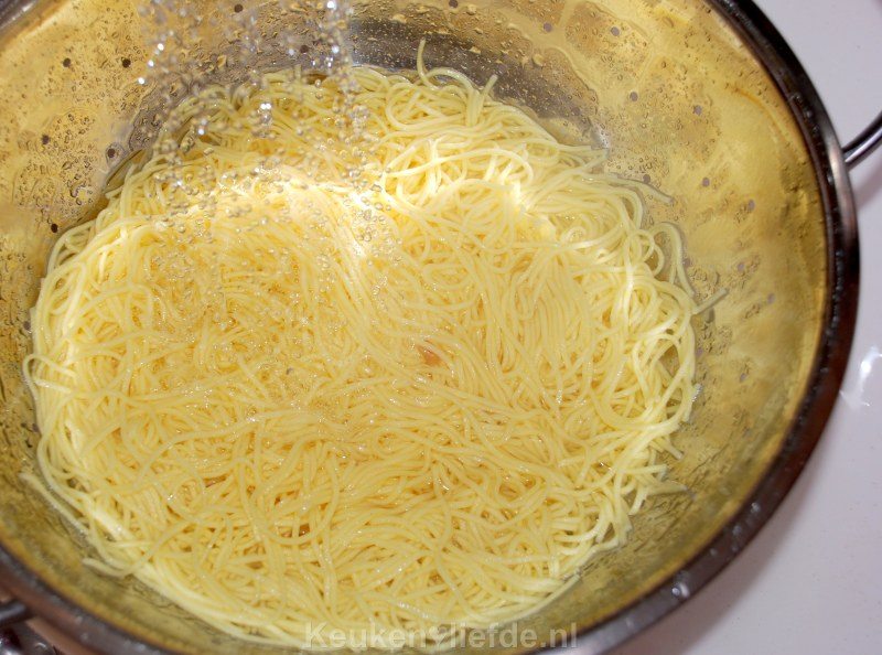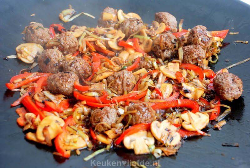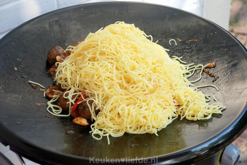 Warm alles goed door (niet te lang anders worden de ballen droog!) en voeg dan de noedels toe. Warm nog kort even mee.