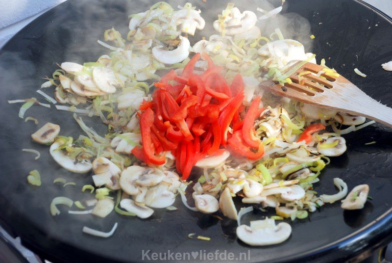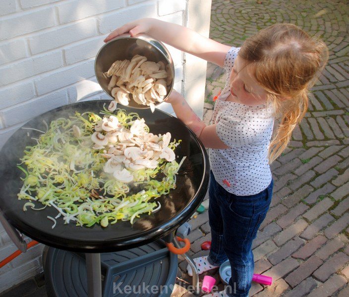 Verhit de wok met wat arachideolie en een klein beetje sesamolie en roerbak de prei kort. Voeg dan de champignons toe en bak verder totdat de champignons hun vocht kwijt zijn. Zoals je ziet kun je dit gerecht ook prima op de scottelbraai maken!