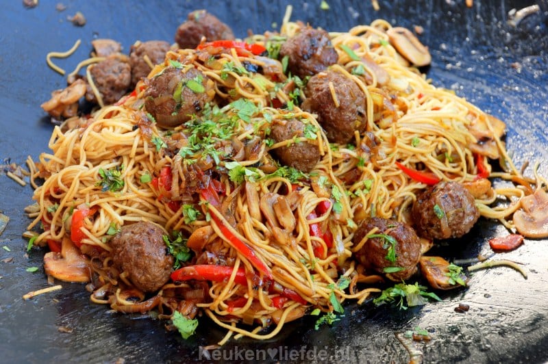 Zowel mijn dochter als ik zijn dol op deze noedels met gehaktballetjes in teriyakisaus. Een heerlijk Oosters gerecht met Hollands tintje! Als je de gehaktballetjes al een dag van tevoren draait, zet je dit gerecht ‘s avonds binnen 15 minuten op tafel. Voor de saus gebruikte ik mijn zelfgemaakte teriyakisaus – die je overigens maakt in een handomdraai! – maar je kunt ook prima kant-en-klare teriyakisaus gebruiken.