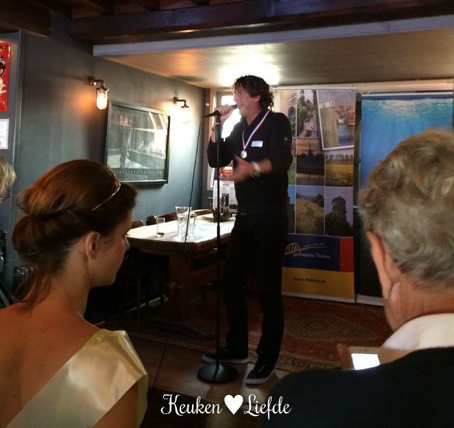Het officiële gedeelte is nu voorbij. Tijd voor culinair én vocaal vuurwerk! Het sterrenteam van Manoir Restaurant Inter Scaldes – waarvan ik eerder al op KeukenLiefde dit sterrengerecht plaatste — laat ons twee verschillende oesterhapjes proeven. Ondertussen zingt Ernest van Hartingsveldt de sterren van de hemel.