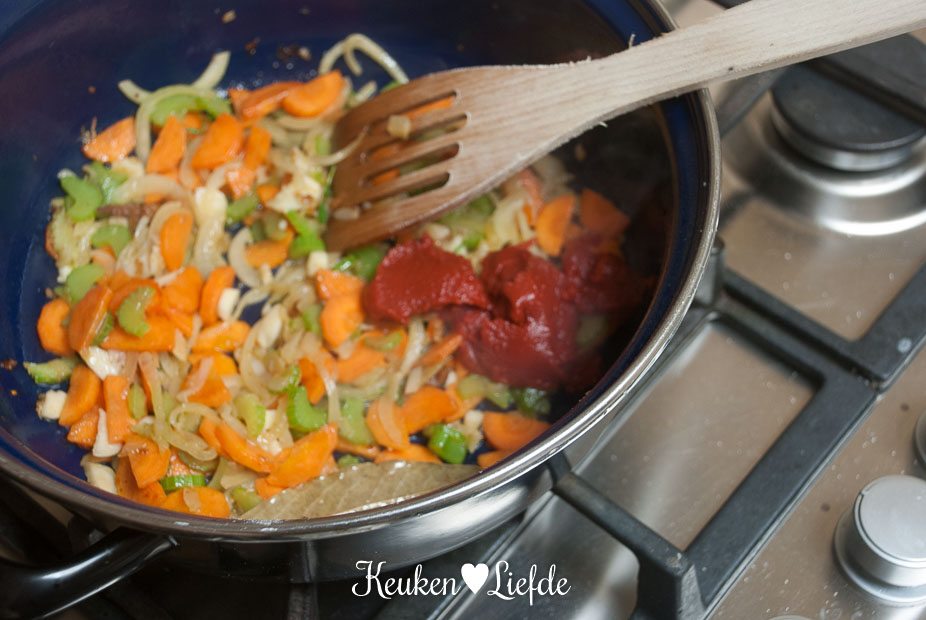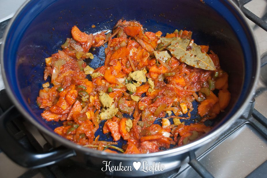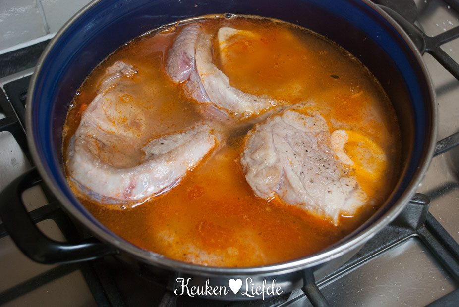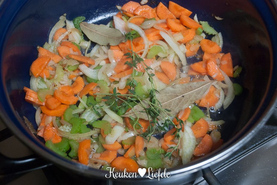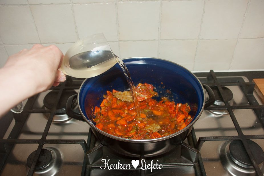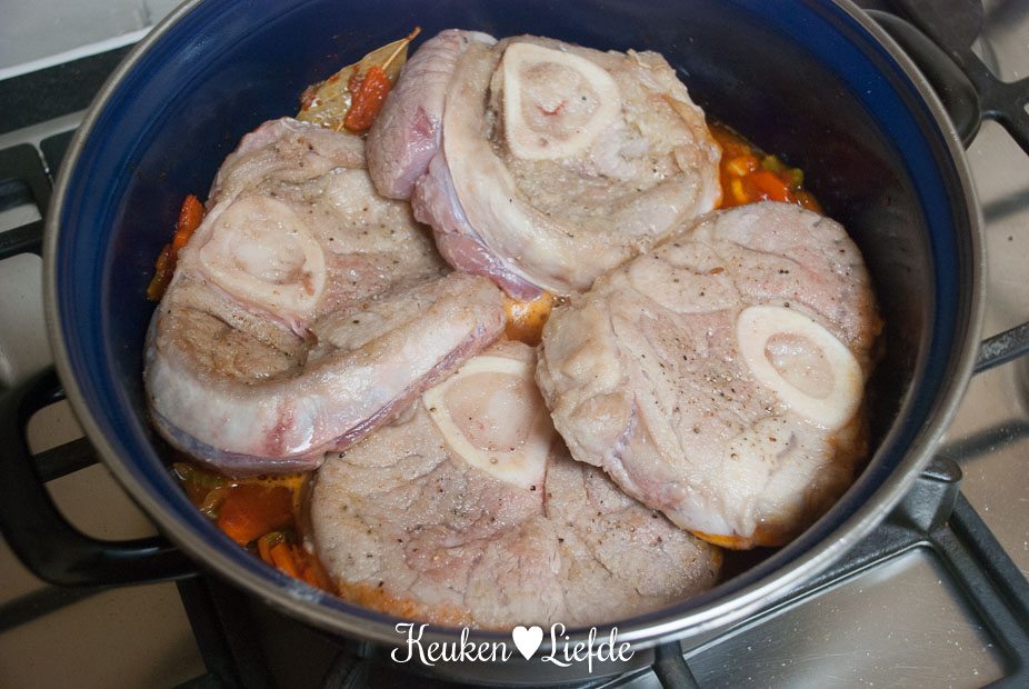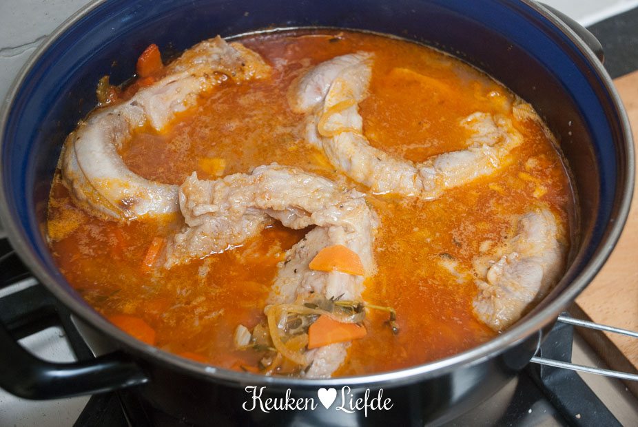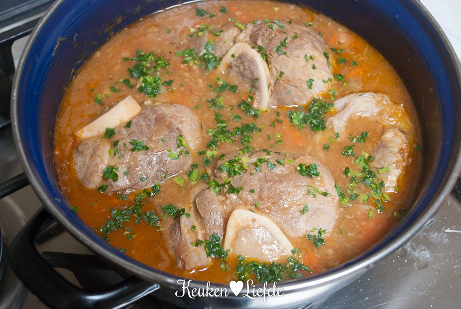 Breng het vocht aan de kook en zet het vuur dan heel laag. (Ik zet de pan op de laagste pit, op een vlamverdeler.) Doe de deksel op pan en stoof het vlees in circa 2 uur zacht. Het vlees is goed als het makkelijk van het bot loslaat. Houd in de gaten dat het vocht niet meer gaat koken, het mag alleen heel zachtjes pruttelen.