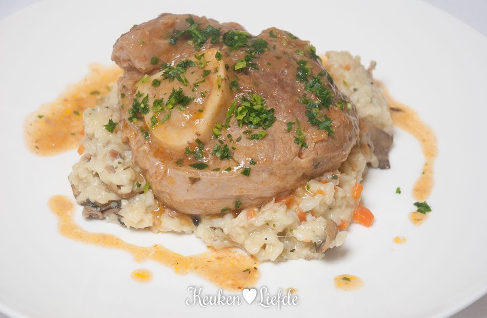 Schep wat risotto op een bord en leg daar een hele kalfsschenkel bovenop. Druppel er tot slot wat van de saus omheen.
